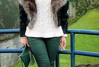 El pantalón lo combino con un jersey de punto de ochos de estilo muy casual, encima me he puesto una chaqueta de astracán y cuello de zorro que combinada con este tipo de pantalón y jersey se le quita su aire de " chaqueta de vestir ".