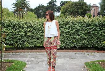 Para dar protagonismo al pantalón lo he combiando con una prenda lisa en color blanco. Sandalias en rojo anaranjado que combinan con los tonos del pantalón y un bolso en dorado. Los metalizados tanto el dorado como plateado son tendencia esta temporada.