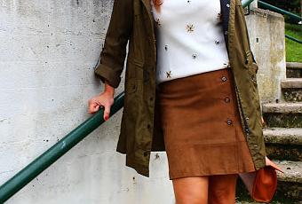 Falda de ante, que es tendencia de esta temporada, con un jersecito con aplicaciones en tonos dorados y plateados y la socorrida parka caqui en tejido fino. Opte por las cuñas de animal print para el pasado martes patear el centro y acudir con mi cita con la radio.
