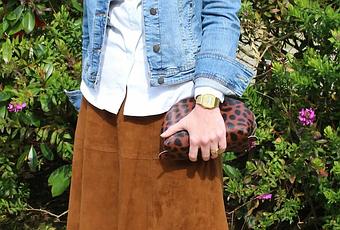 En el look una falda de ante midi acampanada combinada con una camisa blanca básica y cazadora vaquera encima. Ya sabéis lo útil y versátil que es la cazadora vaquera para usarla en entretiempo.