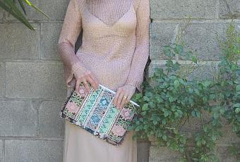 El look de hoy es un look que me gusta por ser diferente. Se trata de la combinación de una falda plisada de tejido tipo lurex y jersey a juego en el que he jugado con las transparencias.Todo el look es en un tono rosa cálido y suave que le dá dulzura y para contrastar lo he combinado con un bolso de pedrería de colores.