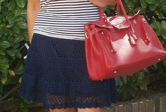 La he combinado con una camiseta de rayas básica y para darle color bolso y sandalias rojas.