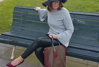 El look es sencillo, pantalón de polipiel con jertsey gris con el detalle de la manga acampanada, combinado con zapatos granates, bolso combinado y un sombrero.