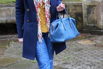 Un look casual con pitillos vaqueros con rotos, un jersey de punto mostaza y un pañuelo de flores para alegrarlo. Y para dar un toque distinto el turbante que me hice de punto pero puesto a modo de diadema.