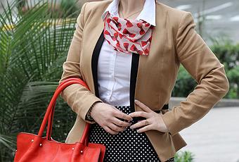 Saco: MNG Falda: Banana Republic Blusa: Esprit Tacones: Zara Cartera Roja: Mar López Pañuelo: Claudia Jimenez Pulseras: Petunia