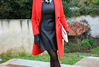 En el look de hoy os enseño de nuevo mi abrigo rojo, esta vez combinado con un vestido de tejido que imita al cuero. Es un vestido de manga corta entallado por la parte superior y la falda con vuelo, un corte muy favorecedor.