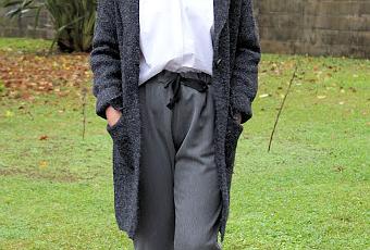 El look de hoy es un look en tonos grises combinado con una camisa blanca que le dá luminosidad. Un look compuesto por un pantalón estilo baggy, una camisa masculina y un abrigo oversize que complementamos con un maxi collar en plata y un borsalino en tonos grises.