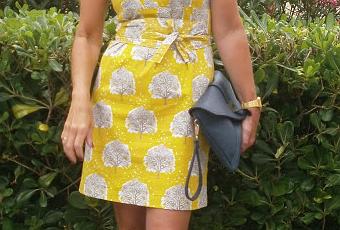 Hoy os enseño otro vestido, este tiene un estampado de árboles con fondo amarillo. Tiene escote en uve y no tiene mangas, se ciñe a la cintura con un cinturón de la misma tela.