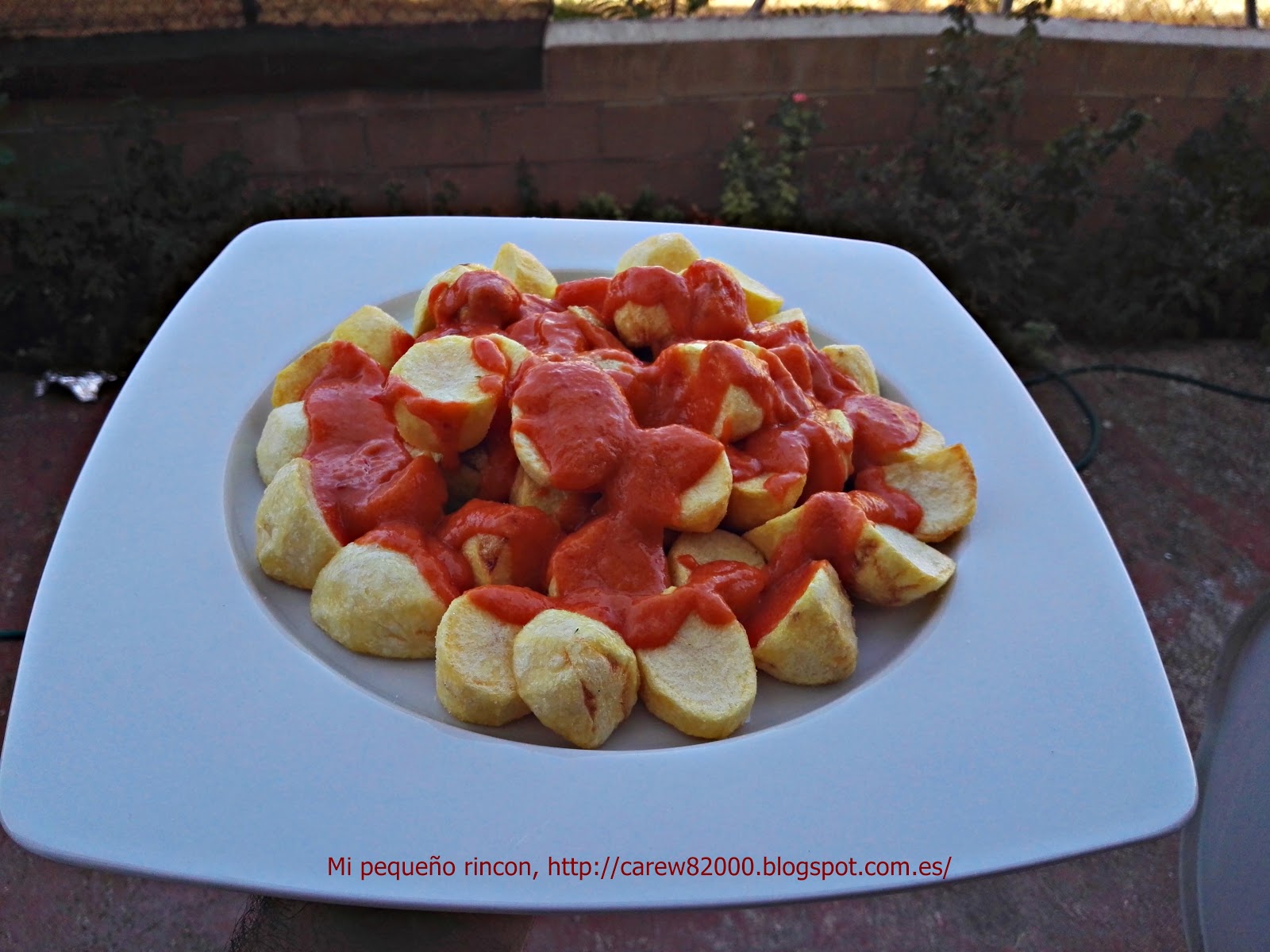 La dejamos cocinar 15 minutos y la colocamos en un bol y dejamos enfriar, cuando se haya enfriado le mezclamos la mayonesa con ayuda de una varilla removemos con el tomate.freímos las patatas en aceite caliente hasta que se doren pues al estar cocidas dejara un crujiente por fuera muy bueno , las dejamos que escurra el aceite con papel absorbente y las colocamos en un plato con un poco de sal y bañamos con nuestra salsa …..(Quedan muy buenas, hacerlas).La presentación es sobre un plato de porcelana de la fábrica Porvasal en Chiva (Valencia).&version;