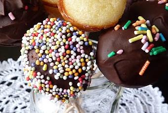 Bate la mantequilla derretida con el azúcar hasta que quede una mezcla ligera y cremosa. Añade los huevos y el azúcar avainillada y mezcla bien. A continuación, añade la harina, la levadura y la sal y sigue batiendo hasta que quede una mezcla homogénea. Pon la máquina a calentar. Pinta los moldecitos con mantequilla y rellena con la mezcla hasta el borde. Es mejor utilizar una jarrita para hacerlo. Si se te sale, no pasa nada, cuando lo saques lo retirarás sin problema. Hornea en el aparato durante 5 minutos y deja enfriar en una rejilla. Repitiendo la operación tres veces más. Cuando los tengas todos solo te queda decorar. Pon el chocolate y la mantequilla al baño maría, sin dejar de remover y vigilar que no se queme. Cuando tenga la textura deseada suca los palos en el chocolate uno a uno y clava uno en cada bola. Deja secar sobre una bandeja apoyando la bola. A continuación, suca las bolas y ayúdate con una cucharilla para intentar que el chocolate quede bien repartido. Antes de que se enfríe, pasa por los fideos o bolitas de colores que habrás colocado en un plato como cuando haces un rebozado. Deja secar clavando los palos en un corcho a modo de bosque. Así con todos. A la hora de servir, los puedes presentar en unos botes de cristal reciclados.