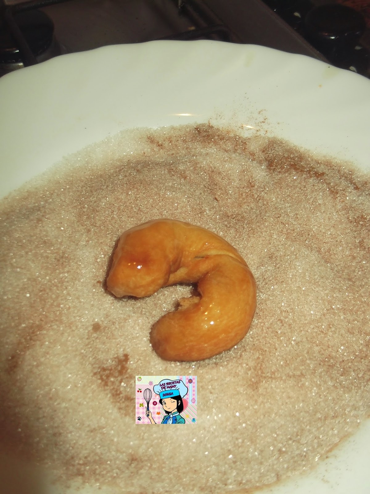 Las empapamos ligeramente en almíbar y las pasamos por azúcar y canela para servir.