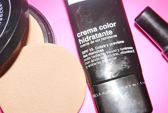 Los productos que he estado y sigo utilizando son la Crema de color hidratante de Bella Aurora, que aplico después de haber puesto mi habitual crema hidratante de la mañana y luego una base compacta de mi tonalidad para luego dar un toque de color en los pómulos.