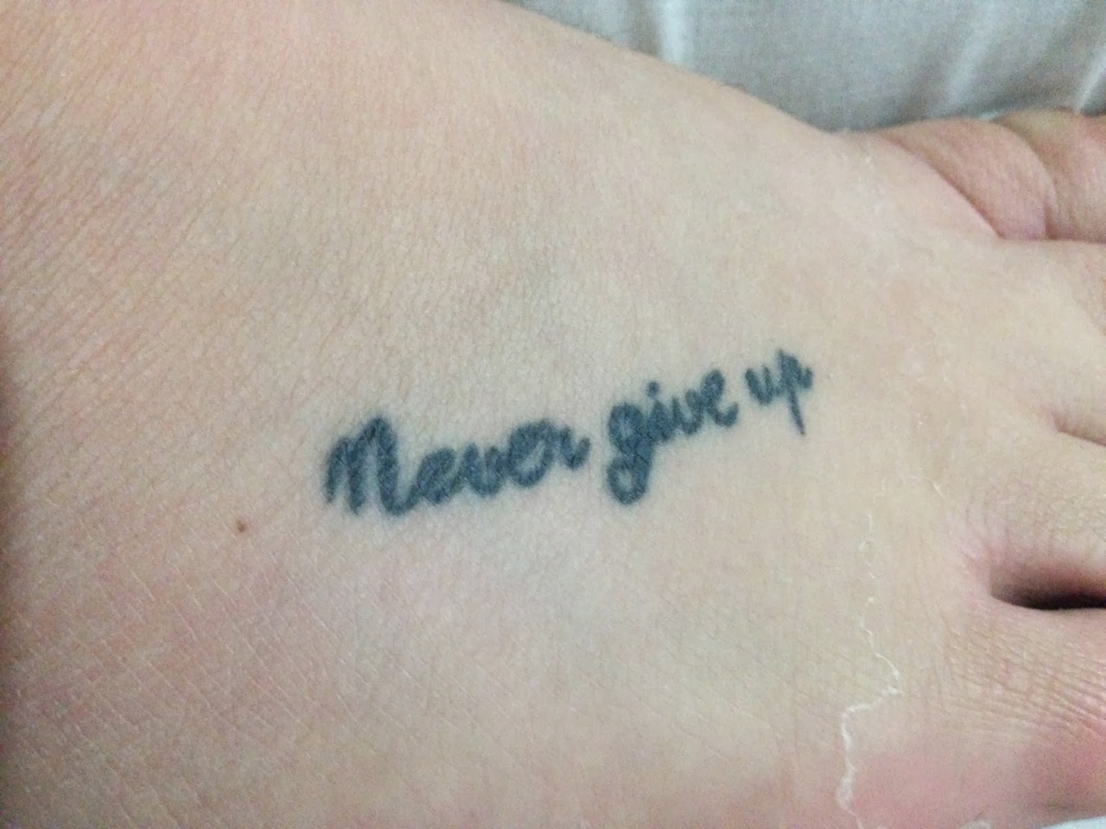 Ahora vamos con el 2…. Una frase NEVER GIVE UP (nunca te rindas) me lo hice en Sevilla, en Montequinto, no me acuerdo como se llama el sitio pero la verdad, me gustó el sitio y el tatuaje era fácil llevaba la frase, el tipo de letra y todo. Así que era copiar y poco más.Y los 2 últimos!!! Mis 2 tesoros y NO CAMBIO al tatuador por nada del mundo!!!