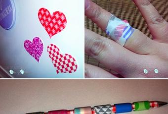 Imanes-corazón que me envió Mar en un pedido, y a los que les pegué un imán adhesivo. Tirita muy handmade: un trozo de pañuelo y washi. Lápiz porta-washis. Para llevar en el bolso más de un washi.