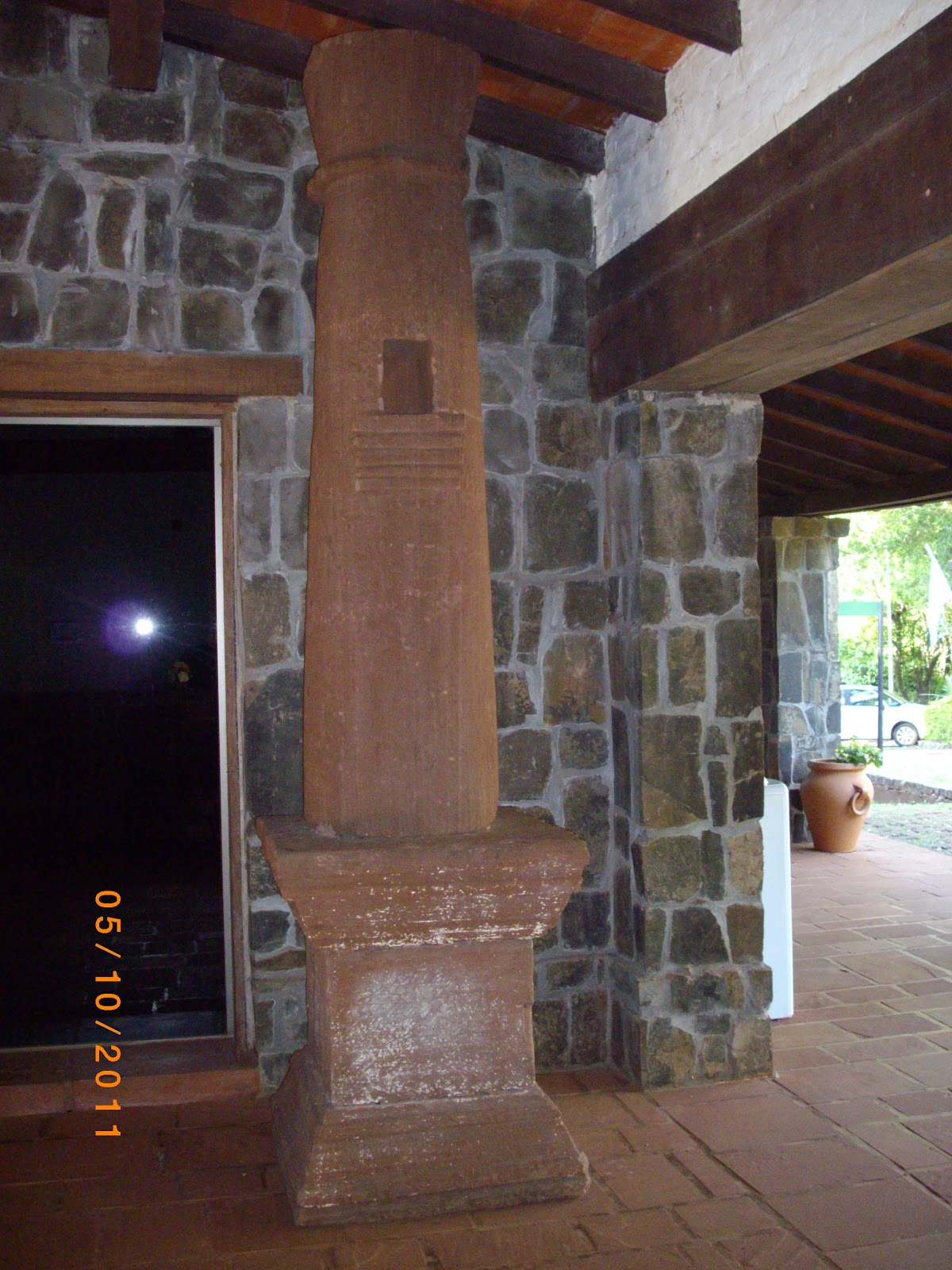 Columna de madera perteneciente a la Iglesia se exhibe en el ingreso.