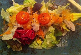 Bueno, los platos empezaron, a llegar, con la ensalada de atún. Una ración justa, y correcta, viendo que el menú se compone de tres platos y postre. Unas hojitas de lechugas variadas, unas láminas de atún y una vinagreta con diversas verduritas. Bueno, quien dice vinagreta dice vinagre en estado puro y en litros. El exceso de vinagre hizo que nos la malcomiéramos, sin valor de llamar al "camareroguapa" para que nos la cambiase.