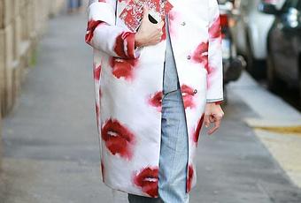 Para la pasada edición de la MFW uno de los looks que eligió, que viniendo de ella lo considero de lo más normal, camisa y pantalón vaquero en donde el abrigo juega un papel importante gracias a su gracioso estampado de labios.