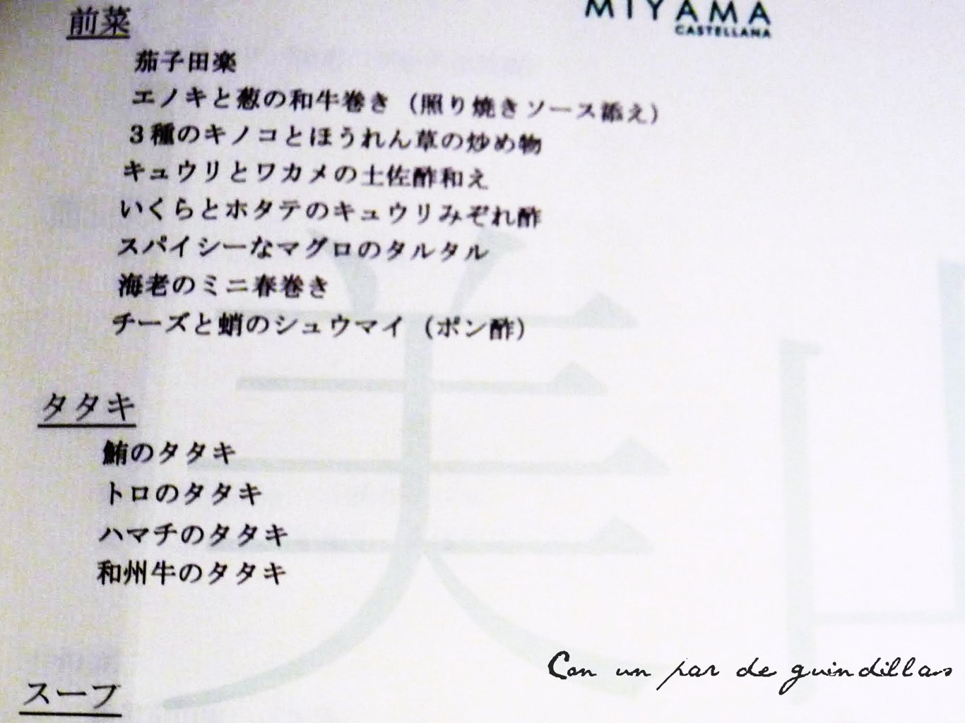 La comida: No voy a poner los nombres de los platos que degustamos, porque confieso que no los conozco, vamos, que nos dejamos asesorar y no me dediqué a apuntar nombres. Además, creo que no hubiera servido de nada:Carta del Miyama san