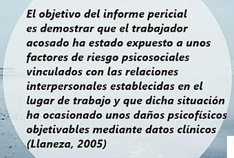 Mobbing… ¿y ahora qué hago?Que representa el trabajo en nuestra vidaEl trabajo es uno de los ejes centrales que guía otros aspectos de nuestra vida. A través del mismo organizamos el resto de nuestras rutinas, a qué hora nos levantamos, cuánto tiempo tenemos para comer, dónde situamos nuestra vivienda…elementos simples que conforman nuestro día a día. Por otra parte, nos aporta una identidad social, metas, propósitos, relaciones personales…Tradicionalmente, valoramos el lugar de trabajo como un entorno seguro donde podemos establecer relaciones interpersonales positivas. Pero si por el contrario no lo percibimos como un lugar seguro y sentimos que nuestra autoestima está cada vez más deteriorada, si sentimos que no tenemos apoyo ni reconocimiento de nuestro entorno laboral… ¿Qué ocurre si nos enfrentamos a las consecuencias del acoso psicológico?Hemos de tener en cuenta que las consecuencias no son únicamente para el trabajador afectado, también existen consecuencias para el núcleo familiar y social así como para la organización laboral, debido a que el hecho de distorsionar la comunicación y colaboración entre trabajadores, interfiere en las relaciones que los trabajadores deben establecer para la ejecución de tareas (Leymannm,1996)¿Qué hemos de hacer ante esto?Puede que nuestro estado de ánimo cada sea más bajo, puede que tengamos dolores de estómago…de cabeza…falta de apetito…Entonces es hora de tomar una solución pero… ¿cuál es? En primer lugar hemos de tomar conciencia de la situación laboral presente, lo que nos permitirá desplegar diferentes estrategias de afrontamiento:1. Comunicaremos al departamento de Recursos Humanos lo que nos esta ocurriendo2. Informaremos a los representantes sindicales existentes de nuestra situación3. Denunciaremos nuestra situación en la Inspección de Trabajo4. Denunciaremos nuestra situación ante la jurisdicción laboral,Si la estrategia 1, 2 y 3 no han dado resultado y decides afrontar la 4, ten en cuenta, que para ello es imprescindiblepresentar las pruebas de estar sufriendo acoso laboral. Es en este ámbito donde el informe pericial psicológico adquiere suma importanciaCon dicho informe pretendemos contestar de forma clara y sencilla al objeto de la pericia, es decir:pretendemos proporcionar al Juez una respuesta fundamentada, comprensible y detallada de la situación presente para así poder asesorarle.El informe pericial psicológico pretende ser un vínculo de comunicación respondiendo de forma objetiva a las cuestiones planteadas, pretendiendo valorar el estado del trabajador afectado así como su posible relación con los hechos acontecidos Pretende ser un vehículo que pruebe el estado de la persona, así como un instrumento para descartar una posible simulación u otras causas que pudieran dar otro significado al estado del afectado.Como hemos mencionado con anterioridad, resultaría imprescindible presentar pruebas de estar sufriendo acoso laboral, resultando apropiado y favorable presentar entonces dicho informe para así poder determinar el daño psicológico del afectado. El objetivo del informe pericial es demostrar que el trabajador acosado ha estado expuesto a unos factores de riesgo psicosociales relacionados con las relaciones interpersonales establecidas en el lugar de trabajo y que dicha situación ha ocasionado unos daños psicofísicos objetivablesmediante datos clínicos (Llaneza, 2005)
