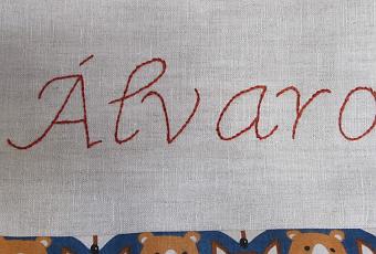 En este caso, con su nombre, bien grande, bordado a punto de tallo, para que nadie se la lleve por error.La tela, una monada, unos zorritos muy simpáticos.
