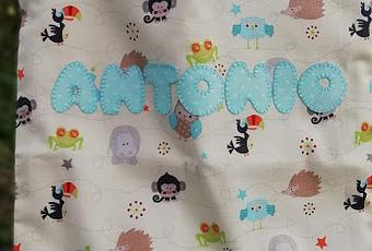 La tela base es la misma, y como es tan colorida casi cualquier tela que le acompañe queda bien. Por detrás jugué con las mismas telas, pero dándole protagonismo a la celeste con lunaritos blancos usando la estampada de animales en una aplicación con la silueta de la cara de un osito.