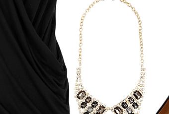 Y si el negro ya es un incondicional de invitadas... ¿qué me decís del glitter? Cualquier complemento que se precie es vistoso. Así que si queremos aprovechar unos zapatos y un vestido negro que tengamos como fondo de armario, podremos ponerle un toque más vistoso, incorporando a nuestro outfit un clutch y un collar bebé de strass. Sin duda los ojos se irán hacia esos complementos que más resaltan por su luminosidad.