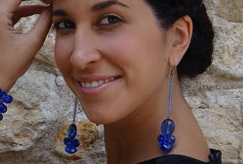 La combinación de colores del vestido en negros, azules y verdes dan mucho juego a la hora de seleccionar los complementos que le queremos poner. Me he decidido por poner en negro el calzado y el bolso, pero darle más protagonismo a unas joyas de cuarzo en tono azul klein, conjuntando perfectamente con una de las tonalidades del vestido.