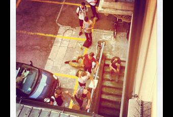 En seguida Mr. Paulson empezó a recriminar que “fíjate estas sectas religiosas…” pero algo raro había… eran demasiado altos, demasiado delgados y demasiado bien vestidos todos! Yo pensé que eran Testigos de Jehová… de pronto se cogen de las manos y empizan a jugar como al “corro de la patata” en círculo y fue cuando vimos a un fotógrafo en lo alto del edificio. Era una editorial para alguna revista lógicamente. Milán y esas cosas que no te esperas))