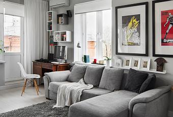 El pequeño estudio está en Moscú y se intuye muy confortable y acogedor, con aires modernos de los 60 y algún detalle retro. De nuevo otro bonito ejemplo de cómo utilizar la gama de grises junto a blanco y madera, como base en una decoración añadiendo texturas en textiles y materiales (pared ladrillo visto en el pasillo, etc.) y toques de color en los detalles decorativos (láminas junto al sofá, reloj sobre el televisor, etc.), para crear un ambiente más personal y único. ¡Feliz lunes!