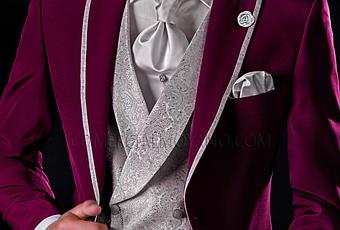 MODELO: 1752 OTTAVIO NUCCIO GALATraje de novio moderno borgoña con vivos a contraste en jacquard gris perla, solapa de pico y un botón fantasía en tejido mixto lana. Traje de novio 1752 Colección Fashion Formal Ottavio Nuccio Gala.