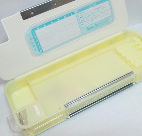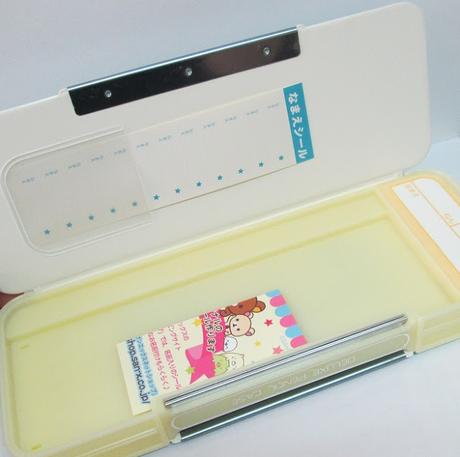 Y, bueno, aquí os enseño el interior del mismo, ya que, este tiene dos compartimentos. El primero, el más gordito, incluye un apartado que es perfecto para poner el horario de clase, instituto y/o universidad. Además, tiene un hueco para poner la goma y algunos espacios para los bolígrafos y/o los lápices. Pero..., si os habéis fijado en la anterior foto, hay una especie de botón, en un extremo, ¿verdad?. Cuando hacemos "click" ¡aparece un sacapuntas!, con depósito (incluido) para guardar las virutas.