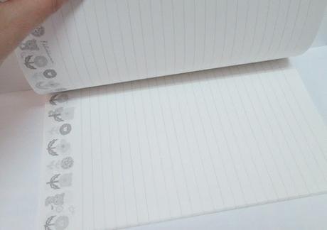Las hojas, de excelente calidad, son pautadas (de rayas), pero no son tan marcadas como suelen tener las libretas que nos encontramos por aquí, en España, ya que, éstas son grisáceas y eso me gusta, jejeje. Y, lo más bonito de todas ellas, es que en la parte inferior (cómo podéis ver en esta foto), vienen con dibujos acorde a las tapas. Sinceramente, es un cuaderno que me ha encantado y que, ahora, no sé para que usaré, jejeje, porque me da una pena..., jajaja, pero seguramente para apuntar ideas para el blog, o algo así.