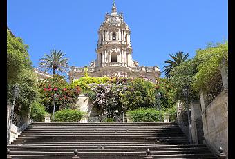 La iglesia de San Giorgio (XVII-XIX)Su magnífico aspecto en tres órdenes, se asoma sobre una imponente escalinata de 254 escalones que hace evidente su belleza.Desde los pies de la escalera, atravesando los “Huertos de Piombo”, se llega a la ciudad baja, directamente a la calle Umberto, repleta de tiendas, confiterías, bares, chocolaterías y palacios como el Vanenti, Tedeschi, Cannata y el teatro Garibaldi.