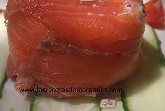 Ponemos en un plato 3 lonchas de pepino, encima el molde de salmón, añadimos unos trozos de tomate y un poco más de vinagreta.