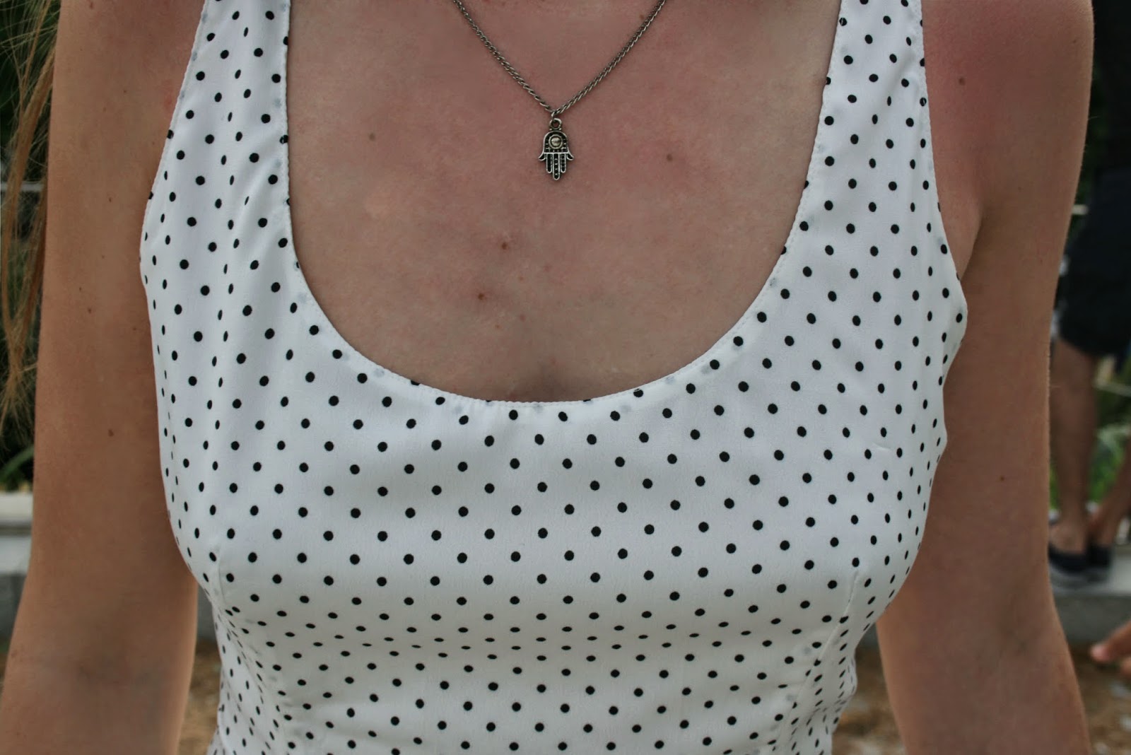 En el post de hoy os enseñados el look que elegimos. Puesto que el plan era una tarde tranquila por Madrid, elegimos un estilismo sencillo y cómodo. Un vestido blanco ceñido a la cintura con tirantes y estampados de pequeños lunares. Los accesorios son muy sencillos, un pequeño bolso de mano y un collar "Mano de Fátima" de Las cosas de Coco Shop. Y como el color nunca debe de faltar en nuestras vidas, unos zapatos azul celeste.