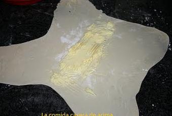 Pasado ese tiempo estiraremos la masa en forma de cruz y pondremos en el centro la mantequilla en pomada, después envolvemos esa mantequilla con la masa y después doblamos otra vez la masa sobre si misma, después cortamos en rodajas y al horno 15 minutos a 200 grados.