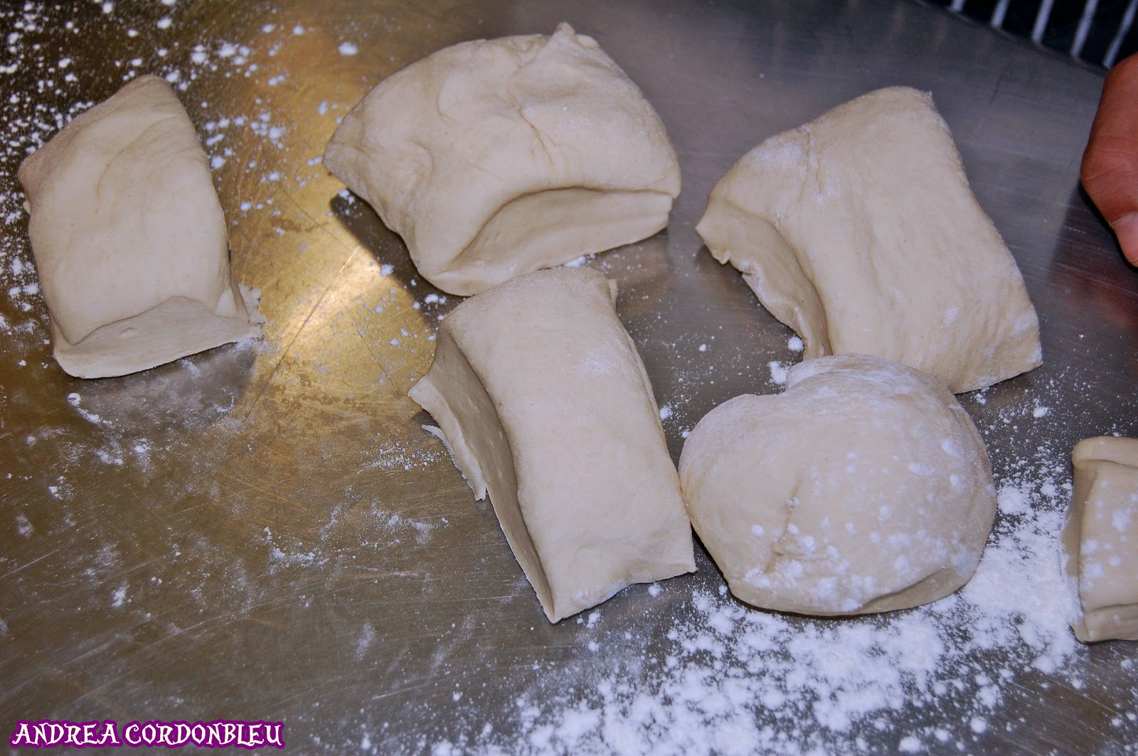Se precalienta el horno a 190ºC y se pone un recipiente con agua en el interior. Se saca la masa del recipiente, se desgasifica y se divide en bolas de de unos 90 grs.