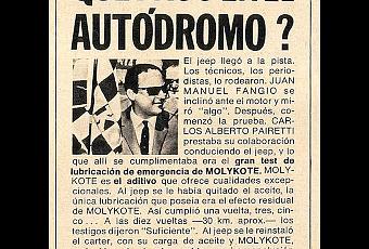 Lo interesante de esta vieja publicidad sobre Molykote es que había dos figuras del automovilismo deportivo involucradas. El piloto del Jeep fue Carlos Pairetti, pero también en la pista estaba presente Juan Manuel Fangio.Como campaña publicitaria tenía su efecto en el potencial público comprador.