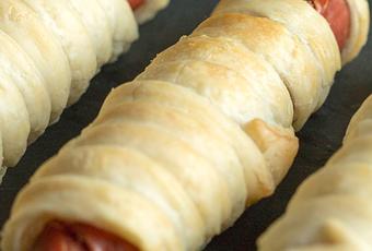 1. Cortamos la lámina de hojaldre en tiras de un cm. más o menos y vamos enrollando cada una de las salchichas con él, de forma que dejemos un hueco donde después pondremos los ojos. 2. Disponemos sobre una bandeja de horno forrada con papel de hornear y colocamos un par de clavos de olor en las salchichas como si fueran los ojos. 3. Horneamos 15-20 minutos.