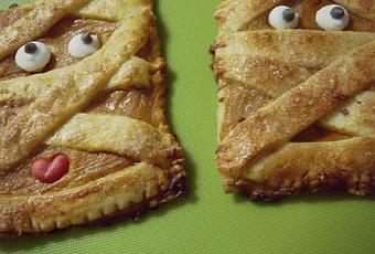Otra cosa, la receta original, la base de las momias es masa de galletas; pero yo utilicé masa quebrada refrigerada y quedaron muy buenas.INGREDIENTES:- 150 gr. de puré de calabaza- 50 gr. de queso tipo philadelphia- 2 cucharadas de azúcar moreno- 1 yema de huevo- 1/2 cucharita de esencia de vainilla