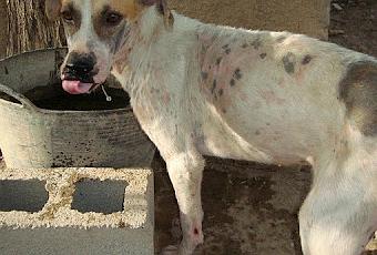 Ella es Momo. Es una perra más del caso de Losa del Obispo, donde había 60 perros y murieron 25. Pero al contrario que algunos de sus compañeros, Momo en vez de mejorar ha empezado a empeorar.