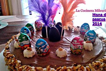 Preparamos la crema de mantequilla, untamos los lados de la mona y le incorporamos las almendras garrapiñadas, (también podemos utilizar fideos de colores, o virutas de chocolate, o almendras fileteadas.Cogemos la manga pastelera y hacemos pequeñas decoraciones con mantequilla, colocamos los huevos, o las figuras que tengamos para decorar y por último unas plumas de colores