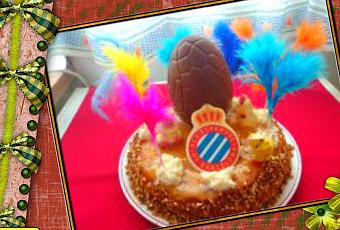 Esta es la mona de este año para el periquito de casa, mi marido y el periquito que tengo en casa y el que tengo en la jaula jajaja. Lo siento periquito yo soy del barça.INGREDIENTES PARA EL BIZCOCHO:150 gr de harina (yo he puesto 75 gr de fécula de patata y 75 de harina150 gr de azúcar6 huevos1 cucharada de levaduraUn bote de mermelada de melocotón.ELABORACIÓN:Separamos las claras de las yemas, montamos las yemas junto al azúcar hasta que tripliquen el volumen. Montamos las claras a punto de nieve y vamos añadiéndolas poco a poco a la mezcla de las yemas de arriba a abajo. Tamizamos la harina junta la levadura y el cacao en polvo añadimos poco a poco de arriba abajo. Engrasamos un molde y precalentamos el horno a 180º. Horneamos durante 25-30 minutos. Apagamos el horno y dejamos la puerta un poquito abierta durante 15 minutos, para que no baje. Dejamos que enfrié.INGREDIENTES PARA EL ALMIAR:100 gr de agua100 gr de azúcarLicor que queramos en nuestro caso de naranja.ELABORACIÓN:Ponemos a calentar al fuego el agua junto al azúcar hasta que espese. Una vez frío añadimos el licor.INGREDIENTES PARA LA YEMA350 g de azúcar75 ml de agua8 huevos50 g de mantequillaColor alimentario ( amarillo / huevo)0,3 g de crémor tártaro ( ácido tartárico ) ( Es importante ponerlo)ELABORACIÓN:Hacemos un almíbar, tiene que llegar a la temperatura de 114 grados si no tenéis termómetro unos 3 o 4 minutos.Mientras en un bol batimos los huevos, junto al colorante, echamos de poquito a poco el almíbar al huevo. Colamos y volvemos a poner en el cazo donde hemos hecho el almibara fuego lento vamos removiendo hasta que espese.Ponemos encima del mármol para enfriar, vamos moviéndolo y recogiendo. Ponemos en un tuper de vidrio y tapamos con papel film para que no haga costra. Cuándo este frió lo ponemos en la nevera.Montamos nuestra mona.Cortamos todo lo marrón, abrimos y pincelamos con almíbar, ponemos una capa generosa de mermelada. Tapamos, volvemos a pincelar y ponemos la crema. Habremos hecho con gelatina de manzana y un 20% de agua un almíbar,pincelamos por encima de la crema, Decoramos a gusto de cada uno.