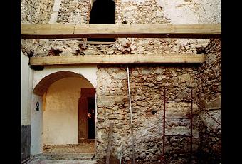 Monasterio de Yuste. Arriba: Hospedería Externa (interior); Abajo: Zagüan de acceso al Monasterio de Yuste (puerta de entrada a la sala de cuadrales). Obras Restauración V Centenario Nacimiento Carlos V. Archivo personal de Luis Cercós.