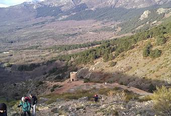 Abajo queda la Torre de la Mina de Plata del Indiano.El sendero monta en la grupa de una ladera ascendente y pedregosa; los montañeros acompasamos el caminar al canto suave del acentor y al constante acecho de la chova de oculto vuelo entre las rocas, el Arroyo del Valle queda a nuestra izquierda cubierto de retamas y paleros, apunta el vedegambre y la genciana entre las sombras luminosas de esta hora matinal cuando llegamos a las ruinas de la Mina de Plata del Indiano.
