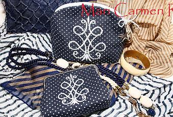 He usado una tela en azul marinocon lunares blancos,y he realizado un bordadocon hilo nacarado, el mismo motivoen ambos pero adecuando el tamaño.