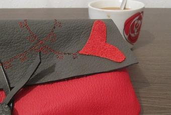 En la solapa hice una aplicación de la misma piel del revés y una puntada decorativa. Compré una aguja especial para piel, aunque parezca raro la cambié, jejeje