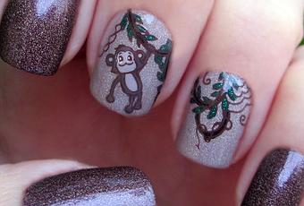 Usé como base unos esmaltes que ya os he enseñado en otras ocasiones "veganos" y holográficos. El efecto holográfico es menos "deslumbrante" que en el caso de otros esmaltes, pero aún así son muy bonitos. Apliqué el marrón oscuro en todas las uñas menos en las que iba a acentuar, con base beige. En la uña del corazón estampé el monito colgando de unas ramas y en la uña del anular tenemos la continuación de las ramas. Ambas imágenes las hice pegatinas caseras para colorearlas.