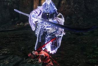 Para atacar te recomendamos usar el Arte de Combate Dibujo Mortal, que no se puede bloquear y aturde. Se lo puedes comprar al mercader del ídolo Tumba Antigua, en la Región Castillo Ashina, por 1.200 moneda. Complementa todos los ataques con algunos barrenos