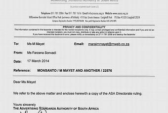 Monsanto se vio obligado recientemente (marzo2014) a retirar uno de sus anuncios después de que la Advertising Standards Authority (ASA) de Sudáfrica determinara que la información en el anuncio no fue probada como cierta. El comercial se jactó de los muchos beneficios de los cultivos transgénicos, pero el Centro Africano para la Bioseguridad (ACB) presentó una queja porque creían que las afirmaciones de Monsanto eran falsas. Enel anuncio , Monsanto afirma que los cultivos de OGM " nos permiten producir más alimentos de forma sostenible mediante el uso de menos recursos; proporcionar un entorno más saludable por el ahorro en pesticidas; disminuir las emisiones de gases de efecto invernadero y aumentar sustancialmente los rendimientos de los cultivos".